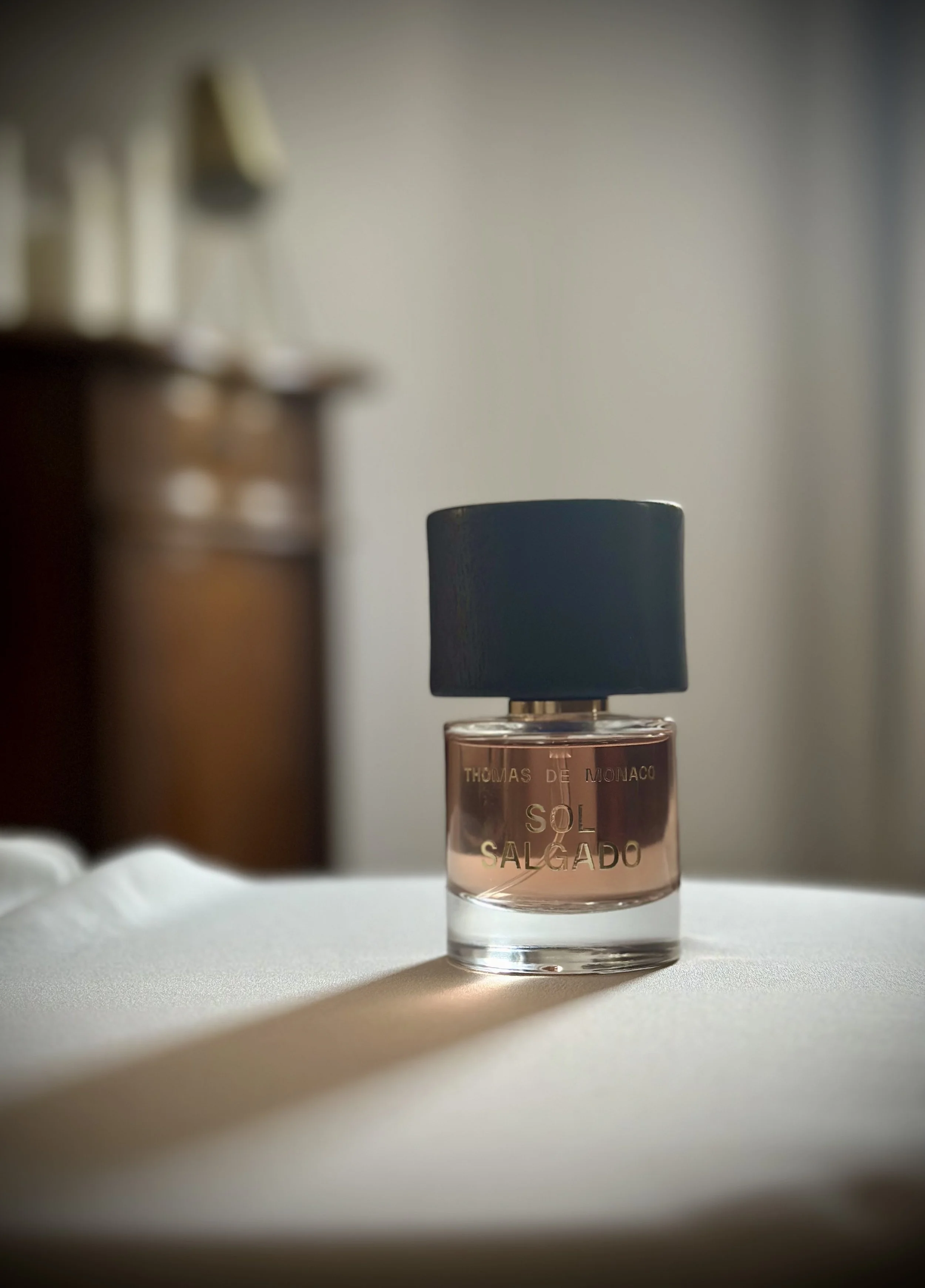 Thomas De Monaco Sol Salgado. A sweet scent of linden-blossom, composed with heliotrope and cotton flower. Salty notes and ambergris add a twist, painting a hot afternoon by the sea—sun-kissed skin and sand in the hair. It smells like vacation.