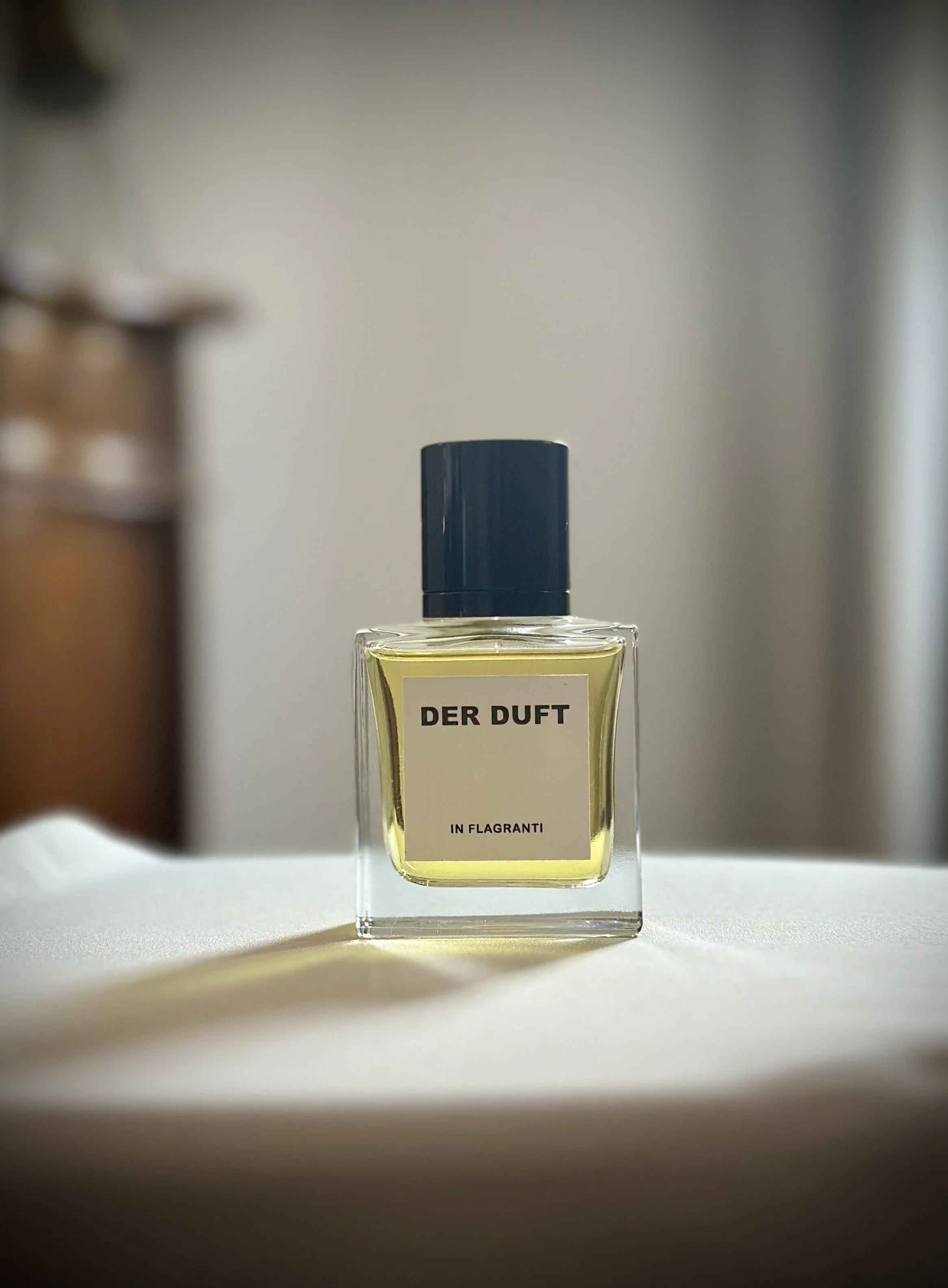 Der Duft In Flagranti. A very unique fragrance combining gourmand accords and flowers. Fresh basil, sweet caramel, juicy peach, raspberry, and strawberry are combined with a bouquet of white flowers. You can be sure it is an attention-grabbing, unforgettable scent.