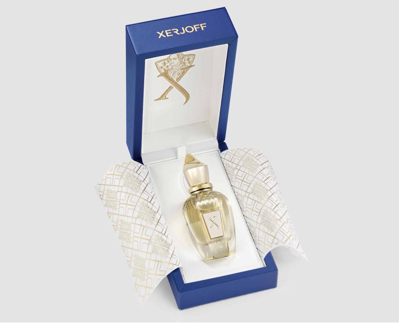 The authenticity and luxury that lies at the heart of Xerjoff is expressed in the awe-inspiring flacon. The perfume is meticulously presented in the classic Xerjoff flacon and is embellished with the royal fleur-de-lis and crowned with a golden cap. The coffret recalls the blue of the fleur-de-lis of France, all wrapped in a luxuriously, champagne coloured sleeve.